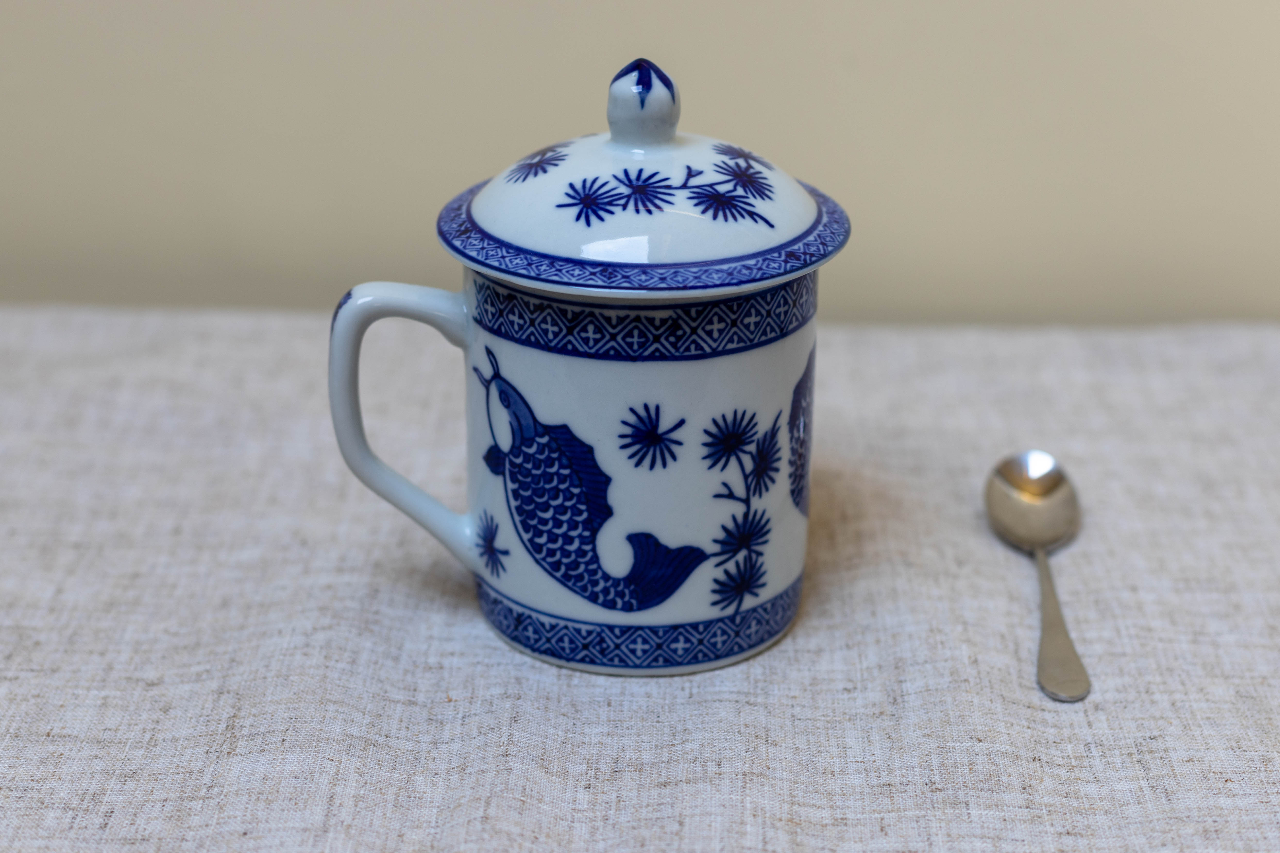 I acquired this cup from a colleague who retired. It’s now my favourite, but I honestly don’t know where it’s from. There’s no stamp or maker’s mark anywhere to be found. It has a handy lid to keep your tea warmer for longer. The king of cups.